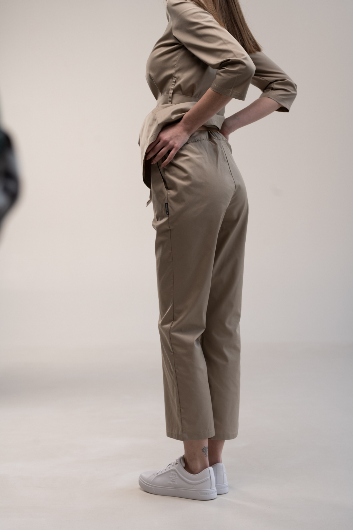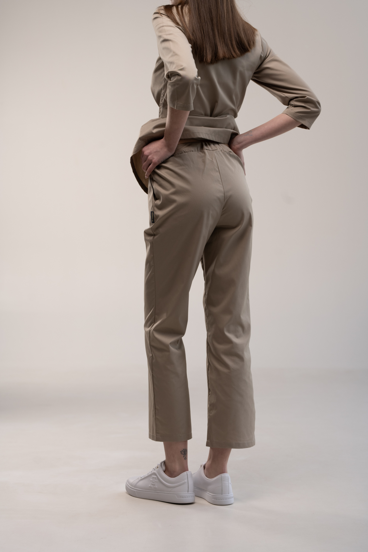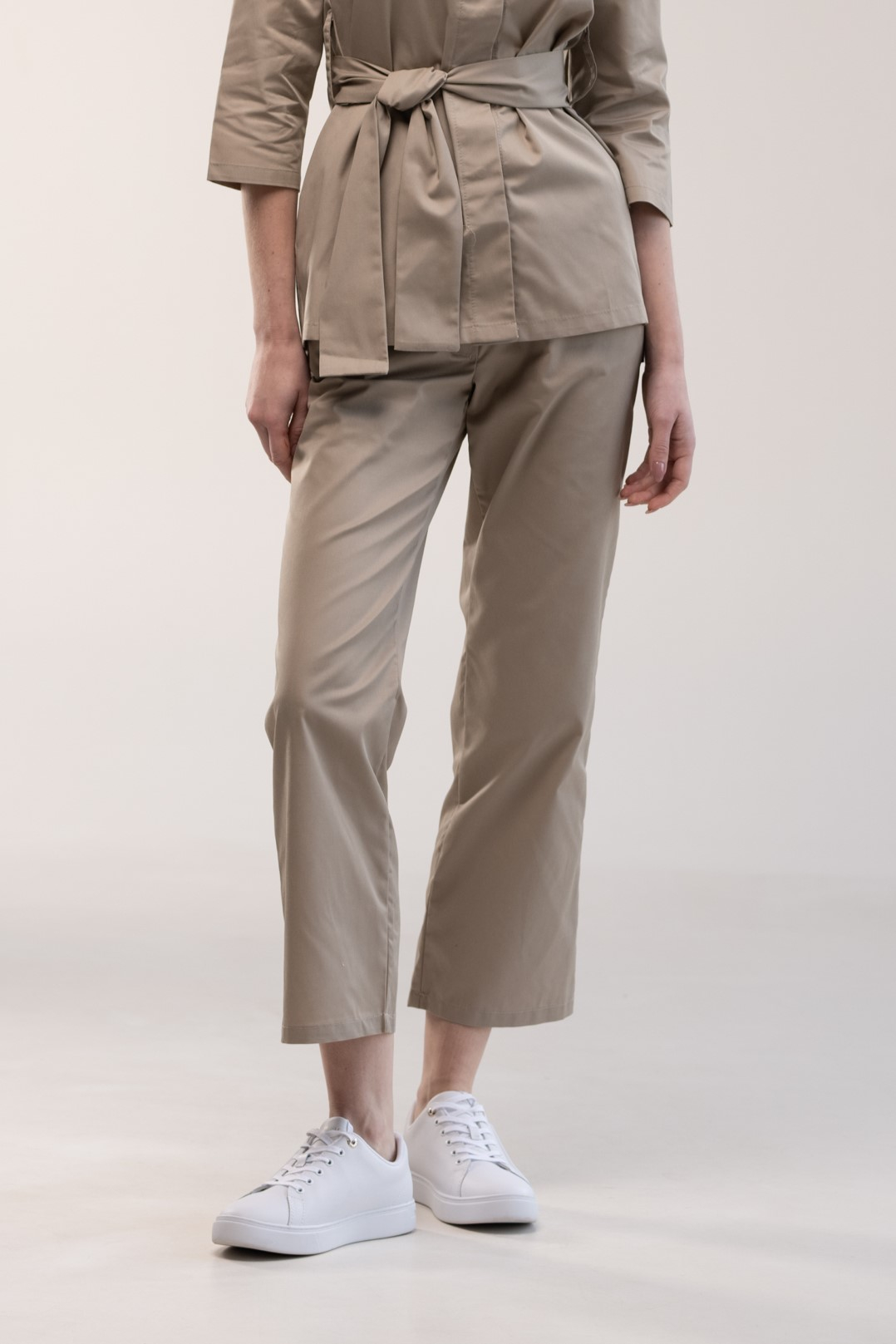 Брюки-кюлоти прямі, вкорочені, з високою посадкою, з імітацією застібки-гульфіка, з боковими кишеннями з косим входом для зручності, пояс на резинці. Довжина до щиколотки.