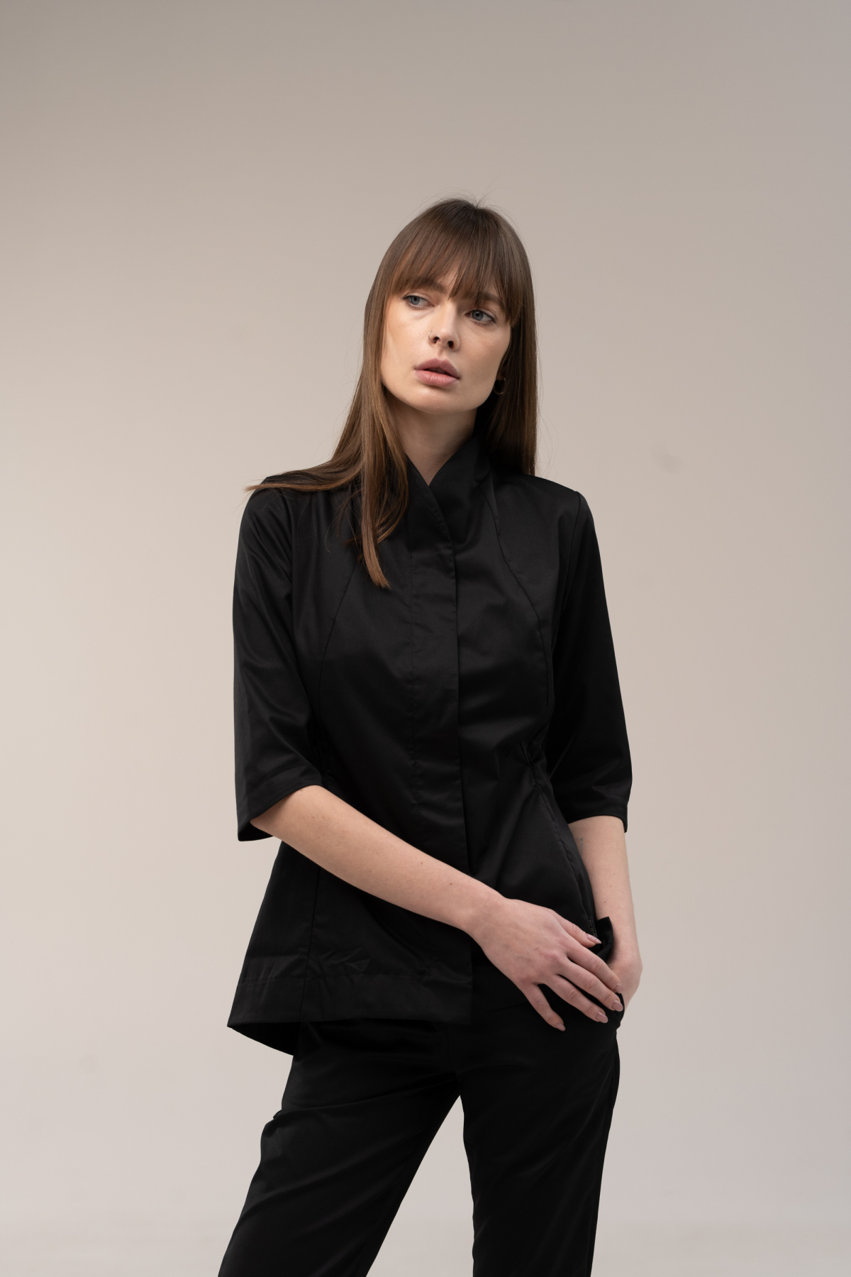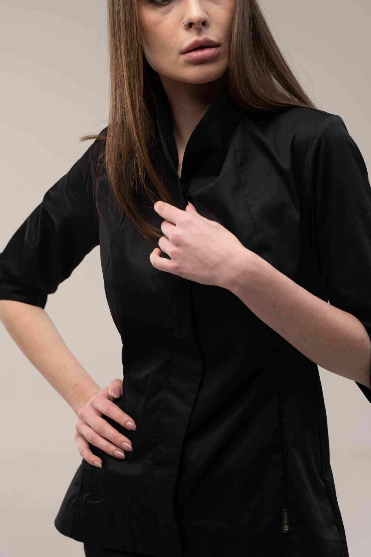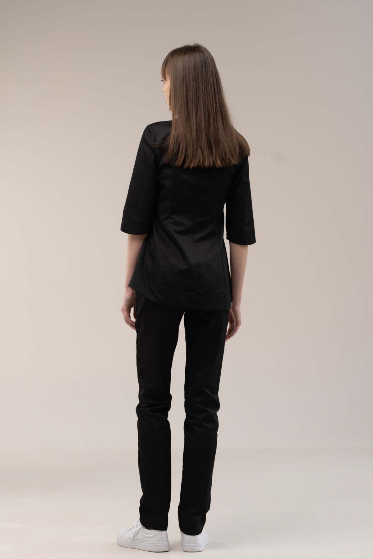 Костюм медичний жіночий. Блуза із супатною - застібкою на кнопках. Низ асиметричний - подовжений ззаду і вкорочений спереду. Комірець-стійка з закругленими краями. Рукав ¾, низ рукава оброблений фігурною обтачкою. У рельєфах на пілочці розміщені кишені. Брюки завуженого покрою з передніми кишенями з косим входом для зручності. Пояс регулюється резинкою.