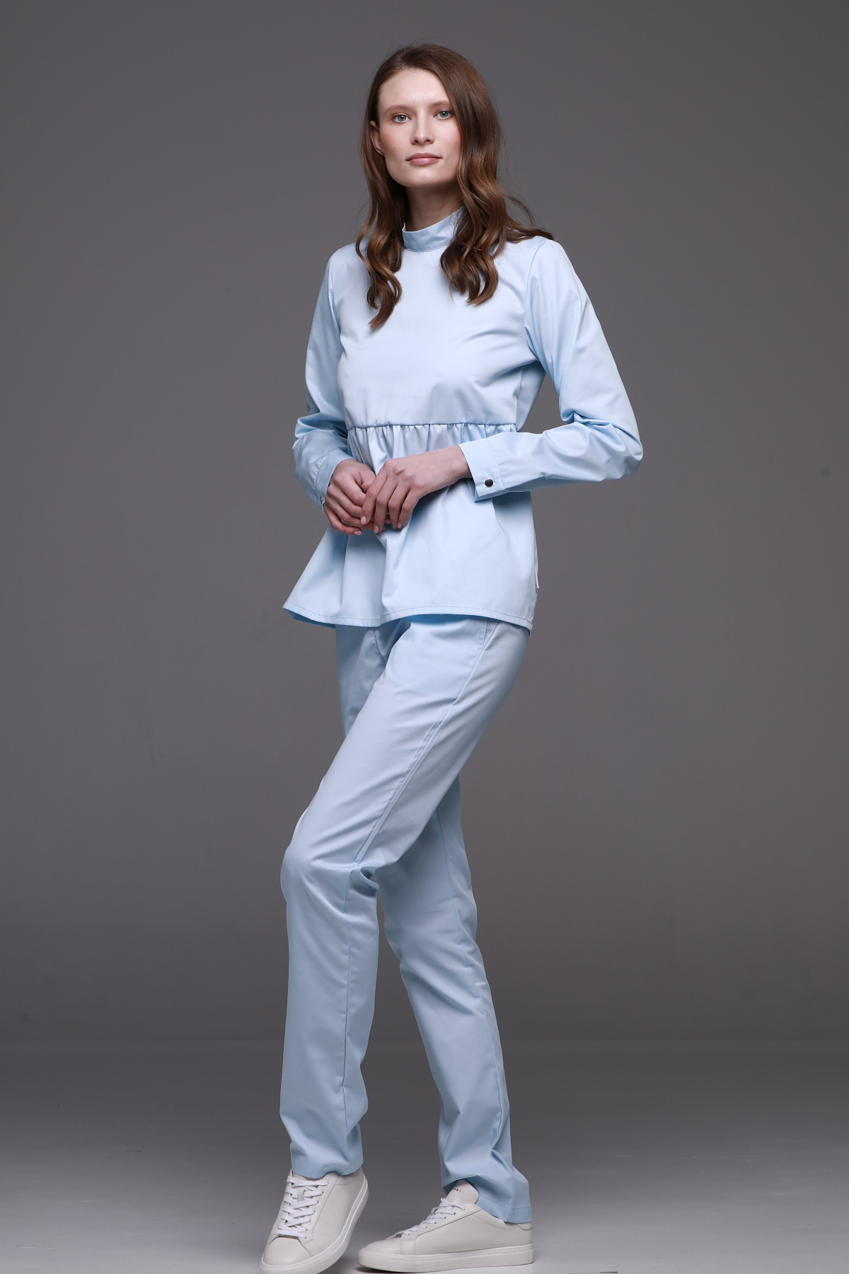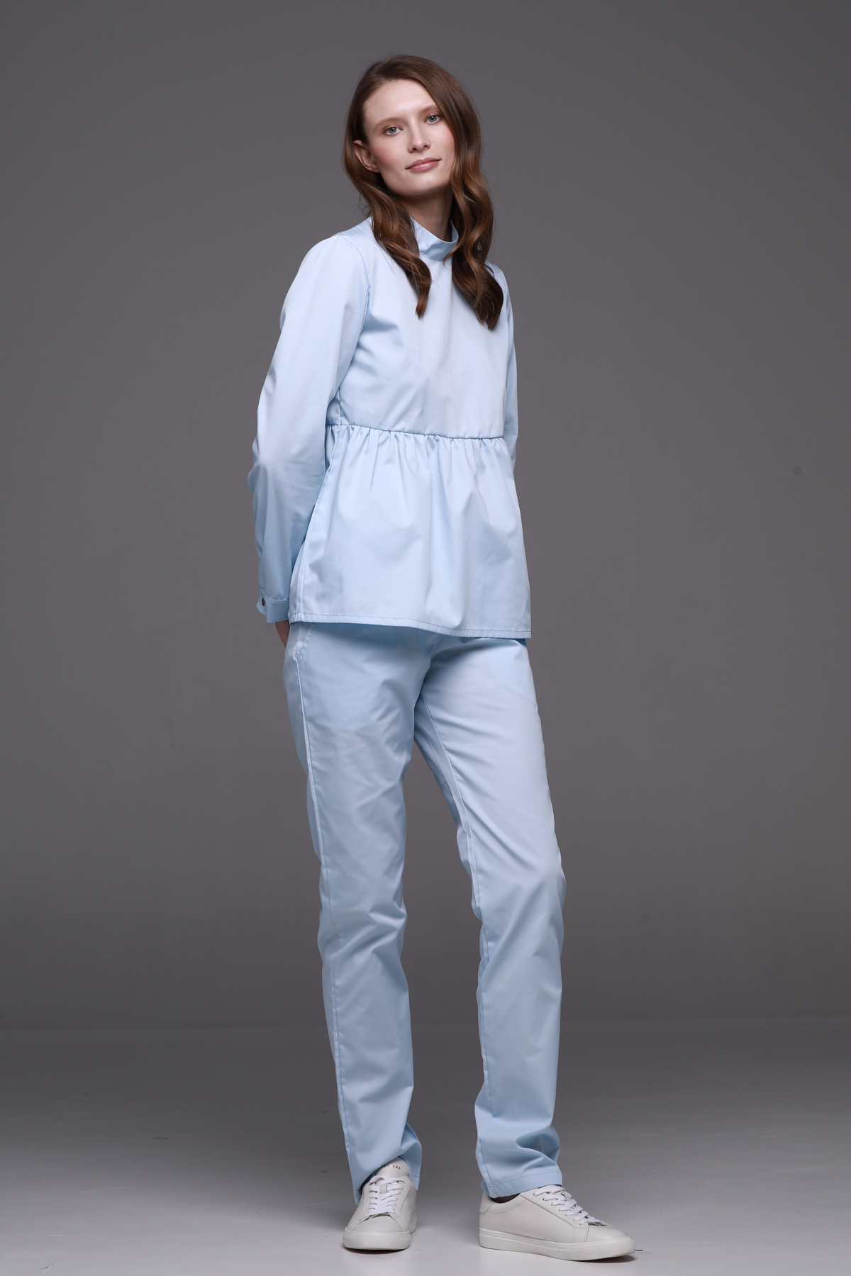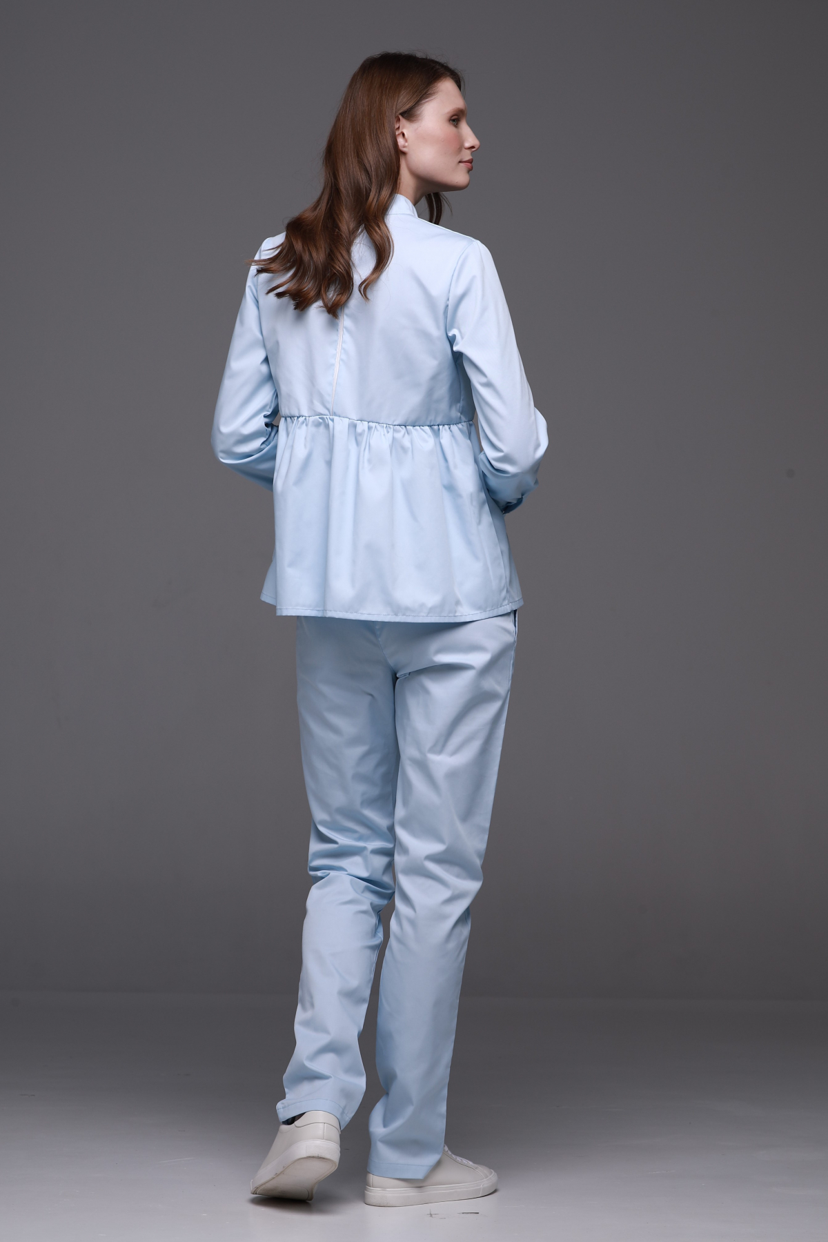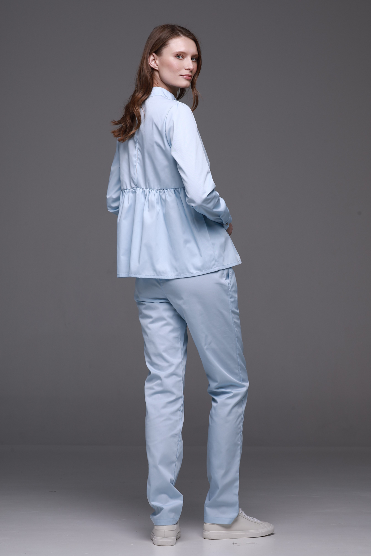 Костюм жіночий. Куртка із завищеною талією, комір-стійка. Рукав довгий з манжетом, який фіксується кнопкою. Модель максимально зручна для вагітних. Штани завуженого крою з двома передніми врізними кишенями.